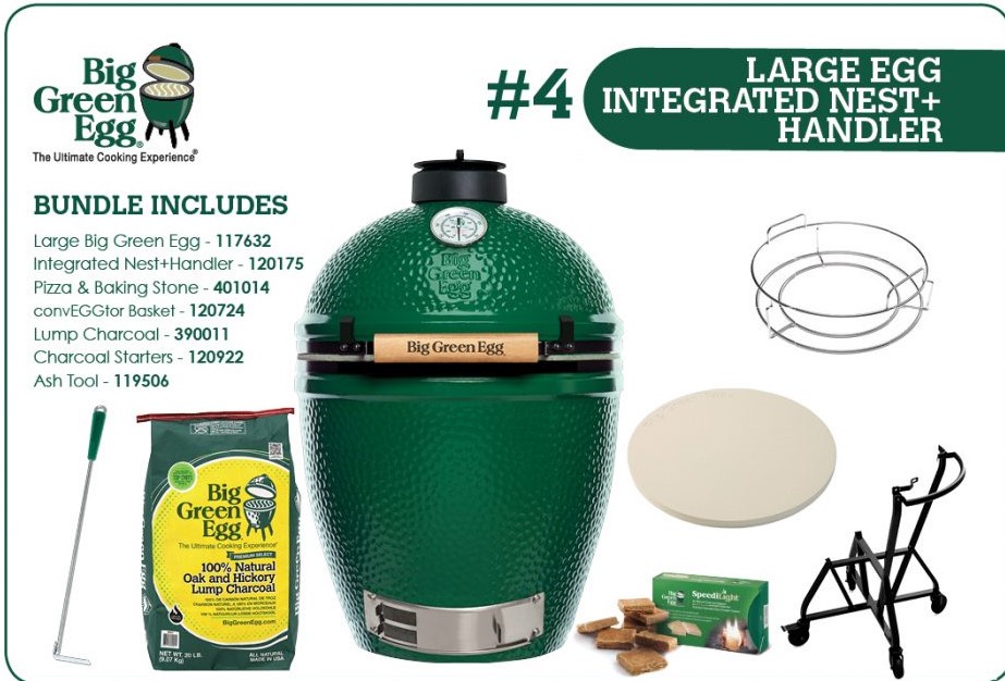 Bundle includes - Large BGE, Integrated Nest + Handler, Pizza & Baking Stone, COnveggtor Basket, 9kg Lunp Charcoal, Charcoal Starters & Ash Tool.