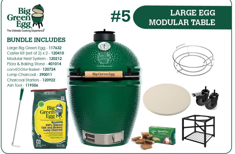 Bundle includes - Large BGE, 2 x Castor Kit Set, Modular Nest System, Pizza & Baking Stone, Conveggtor Basket, 9kg Lump Charcoal, Charcoal Starters & Ash Tool.