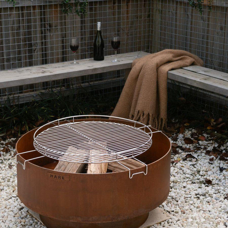 Turn our Hark Corten Steel Fire Pits into a BBQ instantly with our Cooking Grates, offering a unique live fire cooking experience at home.