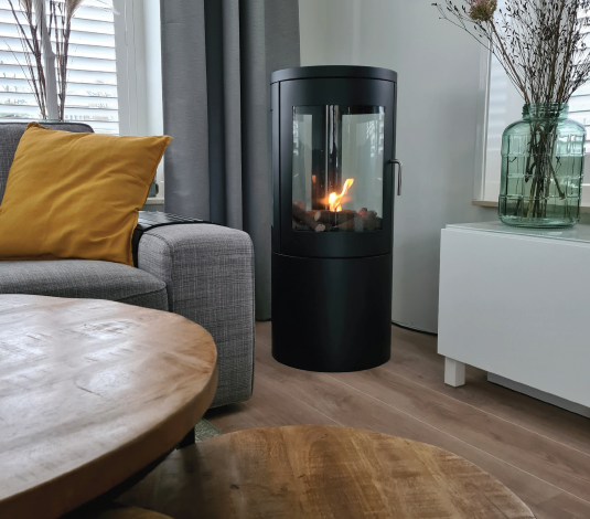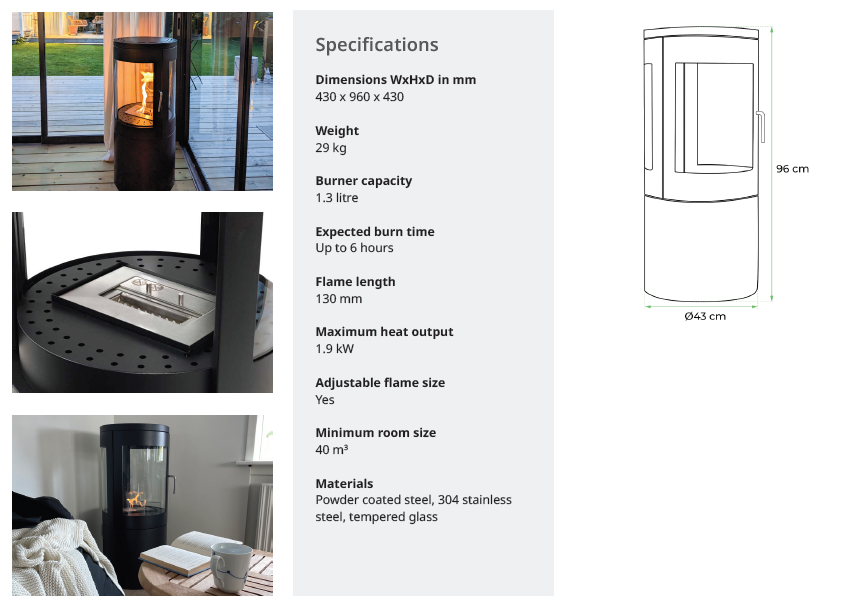 A great innovation from the Danish masters of the ethanol fireplaces. This is an easy to use ethanol firpelace which can easily be transport between rooms or even houses. Perfect for renters. No flue needed.
