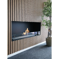 A single-sided built-in bioethanol fireplace is designed to be installed into a wall making the flames visible from the front. This type of fireplace is often seen in media walls or similar where a TV is mounted above the fireplace.