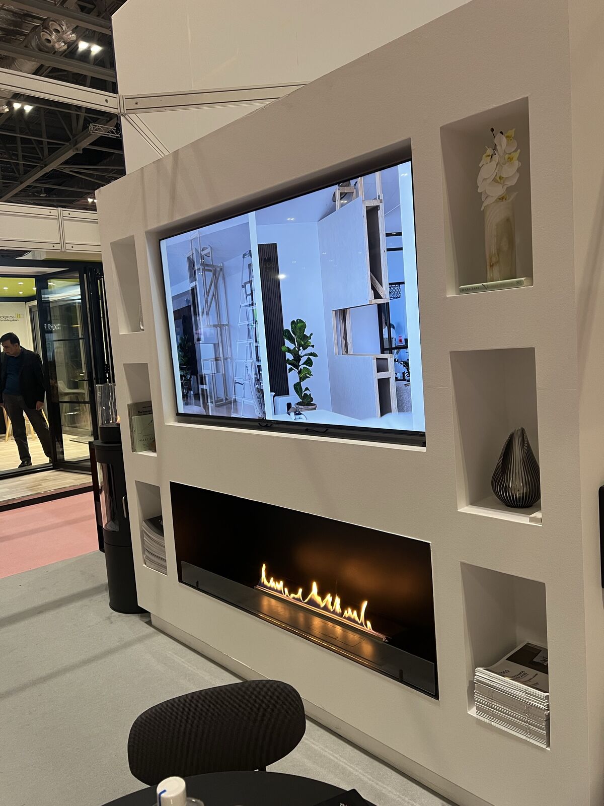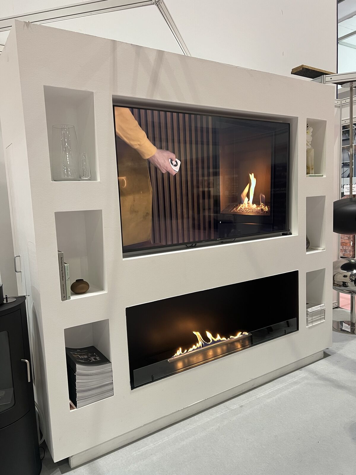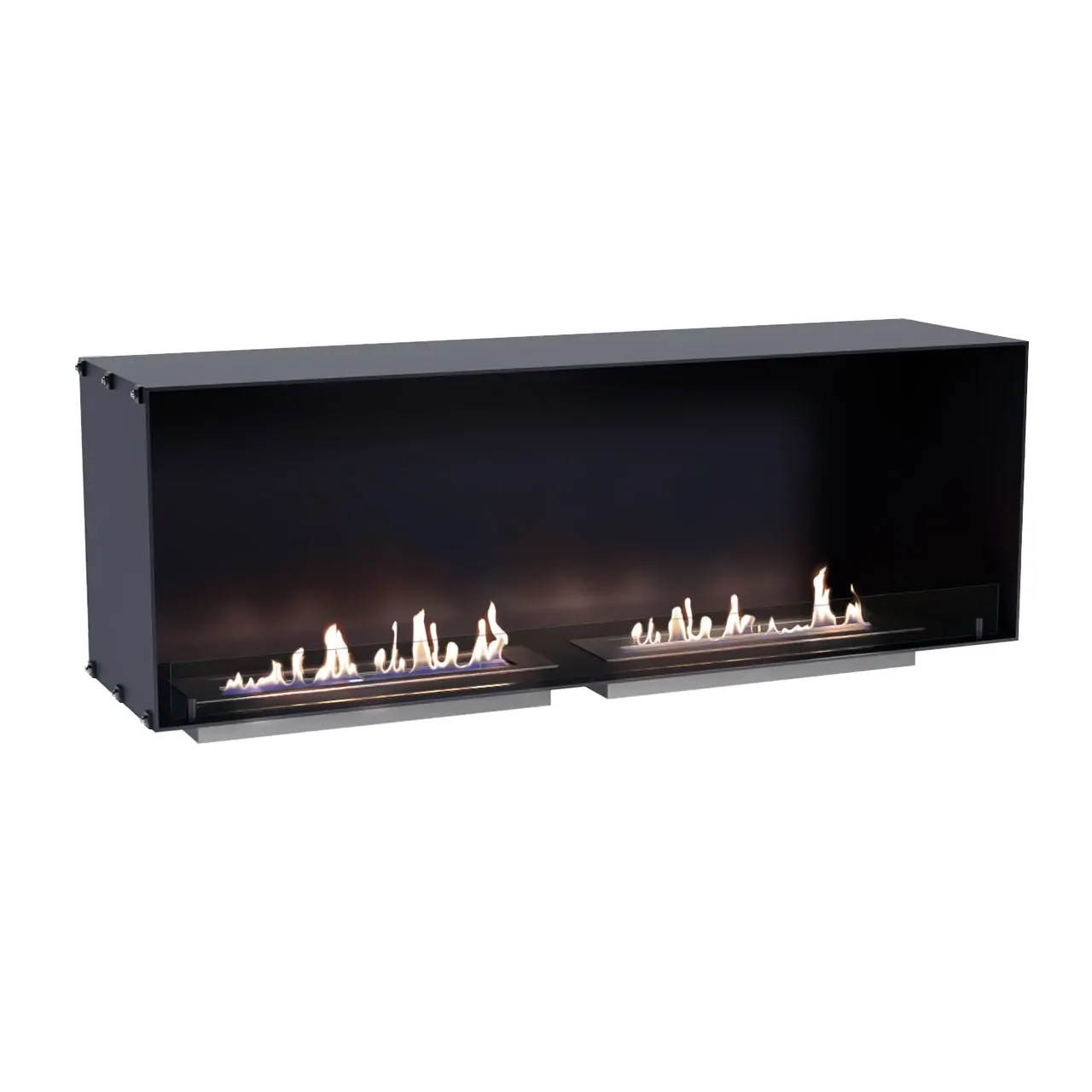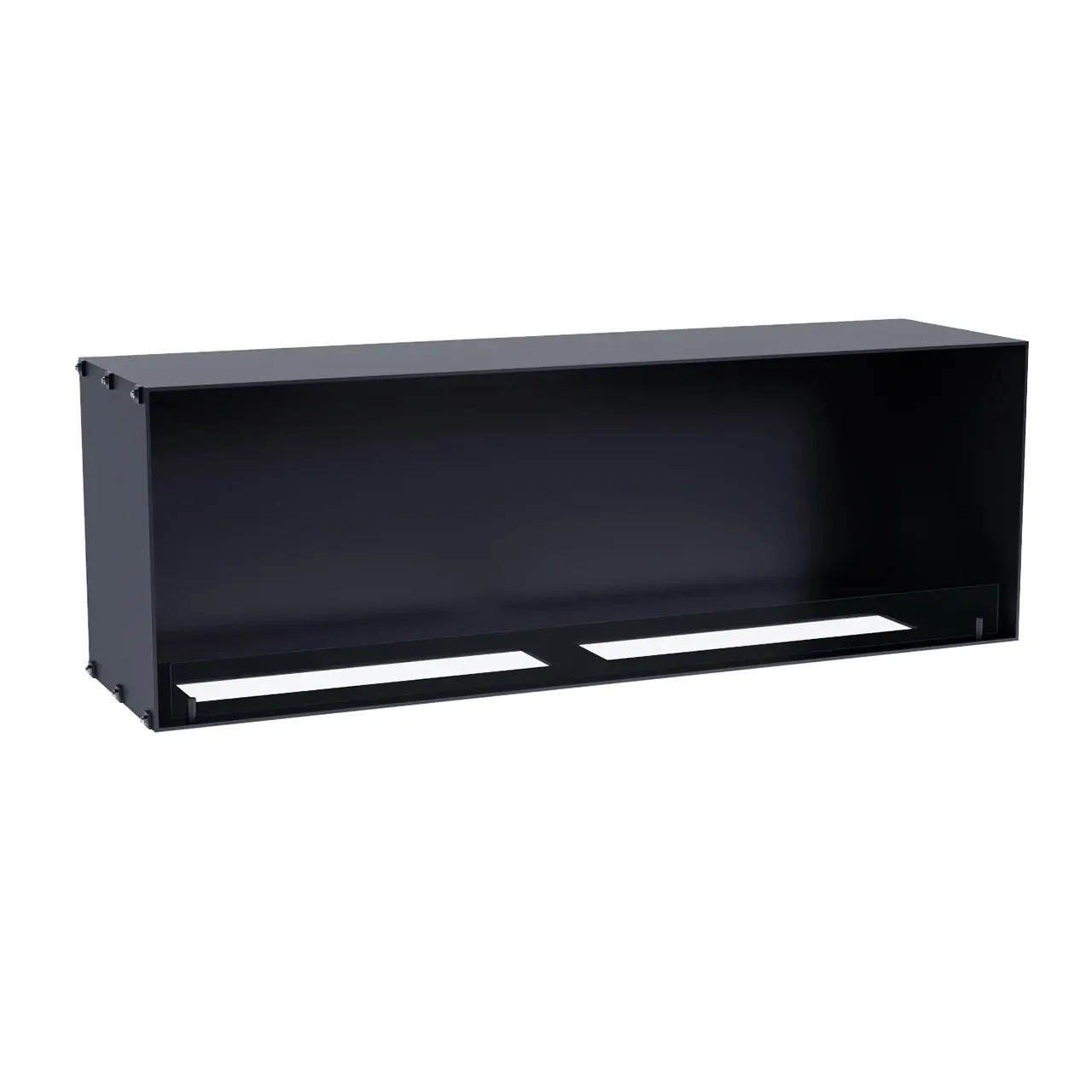 A single-sided built-in bioethanol fireplace is designed to be installed into a wall making the flames visible from the front. This type of fireplace is often seen in media walls or similar where a TV is mounted above the fireplace.