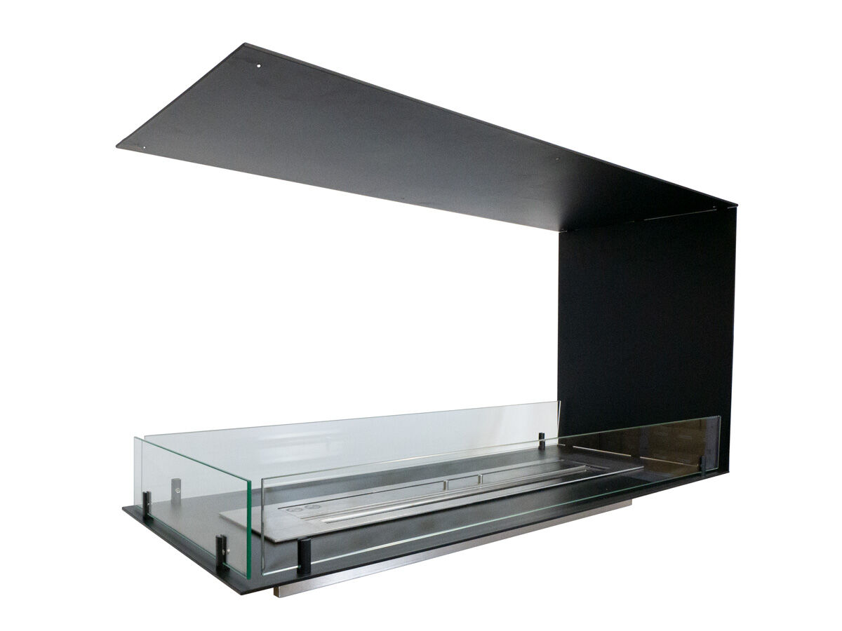 A three-sided built-in bioethanol fireplace is designed to be installed in a wall with flames are visible from three sides of the fireplace. This type of fireplace is seen used in larger living rooms where a wall is used to divide the space into smaller areas. Important: The frame is not load-bearing. The wall must be able to carry the weight of the overhang and the Foco frame.