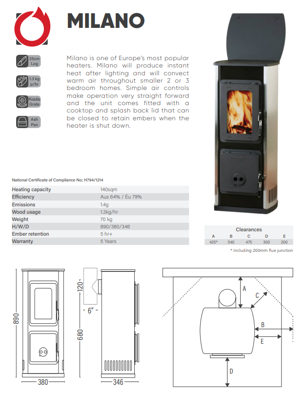 Milano is one of Europe’s most popular heaters. Milano will produce instant heat after lighting and will convect warm air throughout smaller 2 or 3 bedroom homes. Simple air controls make operation very straight forward and the unit comes fitted with a cooktop and splash back lid that can be closed to retain embers when the heater is shut down.