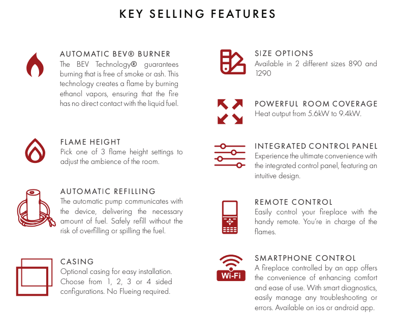 Etlis combines innovative BEV® technology with a sleek linear design to deliver real, clean‑burning flames without the need for a flue or hard connection. Its automatic fueling system, adjustable flame heights and simple canister replacement make it effortless to use every day. Designed for versatility, it fits seamlessly into a wide range of interiors while maintaining exceptional safety standards.